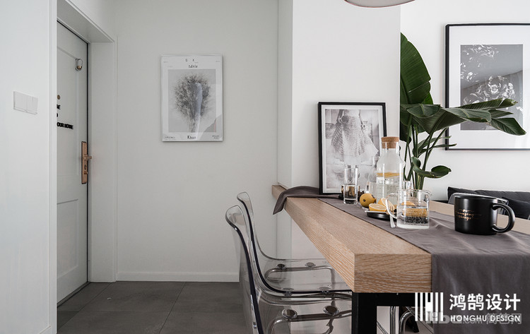餐厅的位置增加设置玄关柜和,大的储物柜,增加过道层次,进门鞋柜跟餐桌做整体设计一气合成