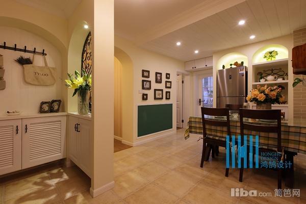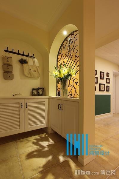 从客厅隐约可以看到隔出来的书房,书房门是一个拱形的造型,和鞋柜左右对称。