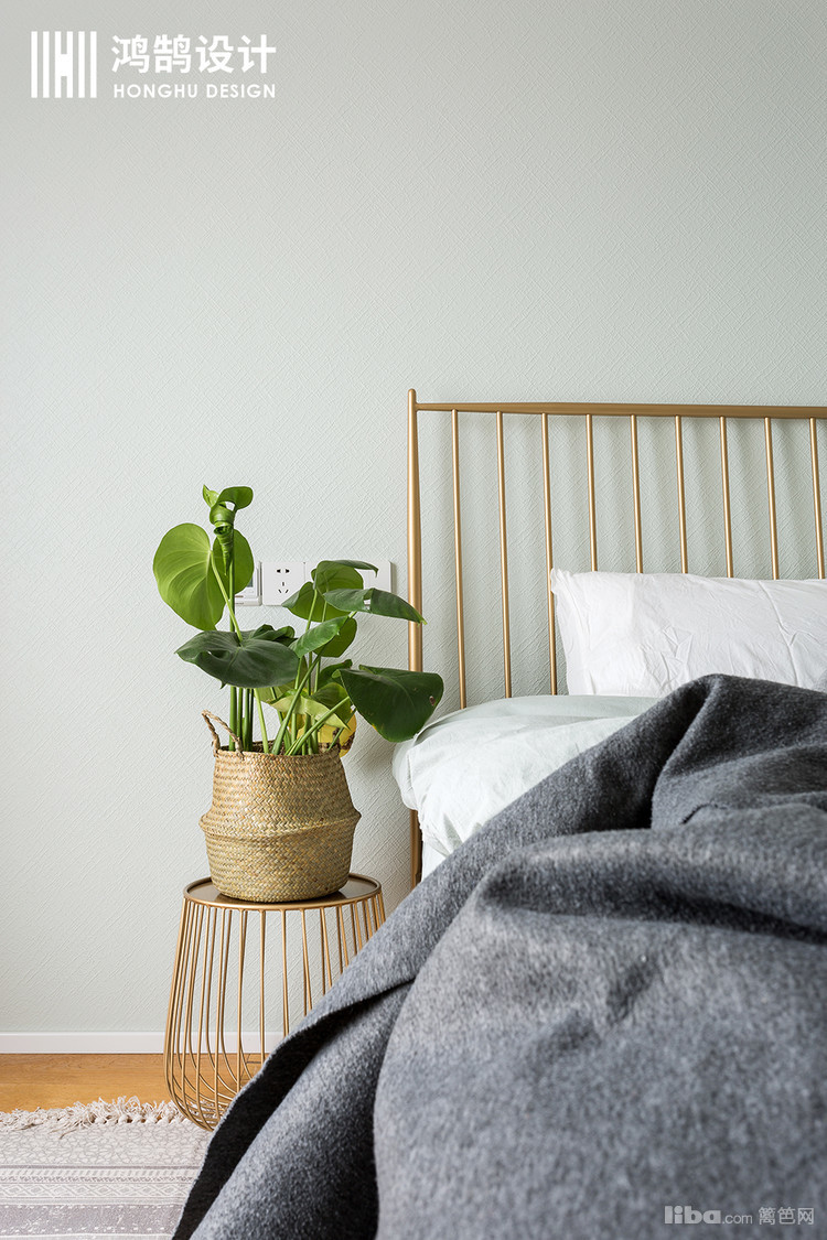 极简的空间中我们却发现很多小心机,比如灰色粉色的异色窗帘,金属质感的床,以及看似简单却有设计感床头柜