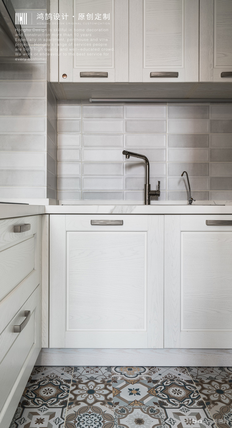 改造后的厨房呈“一”字型,尺寸大小:1600*3700mm。厨房墙面使用100*300mm大小两种不同颜色的砖错位铺贴,能够在视觉上有效地增大开间。