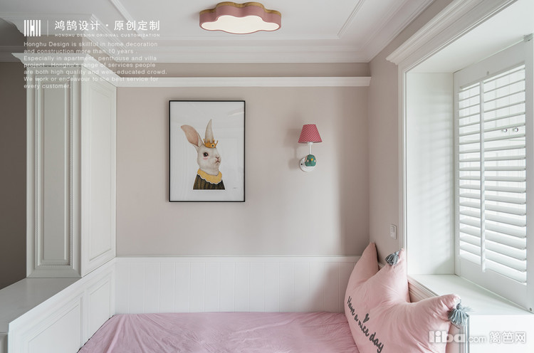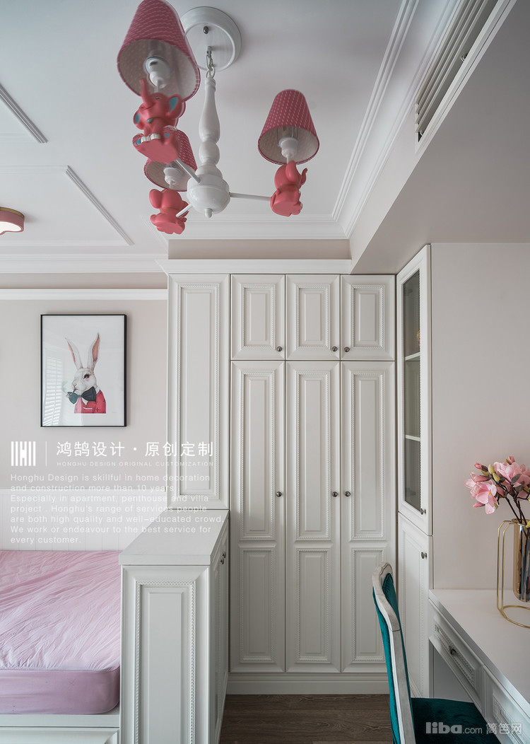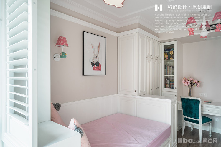 儿童房是原来的主卧,靠着南阳台采光比较好。设计师为两位小天使打造了公主般的居住空间享受。驼粉色乳胶漆墙面与粉色软装搭配满满都是少女心,