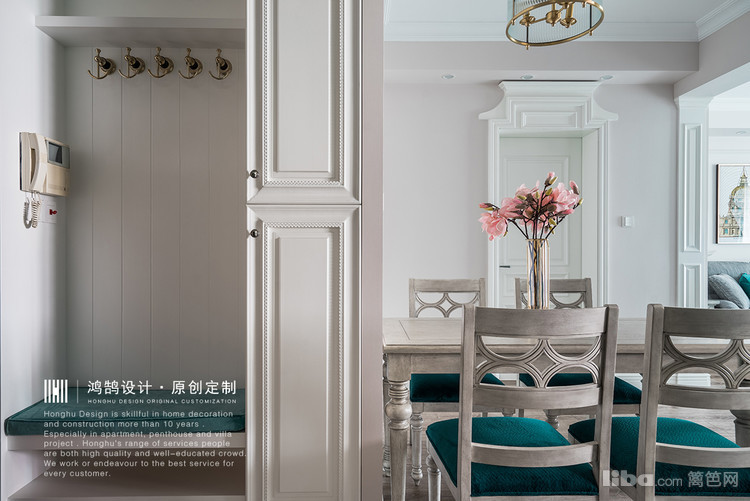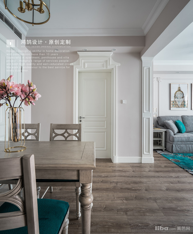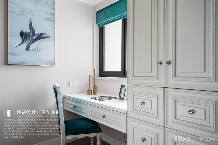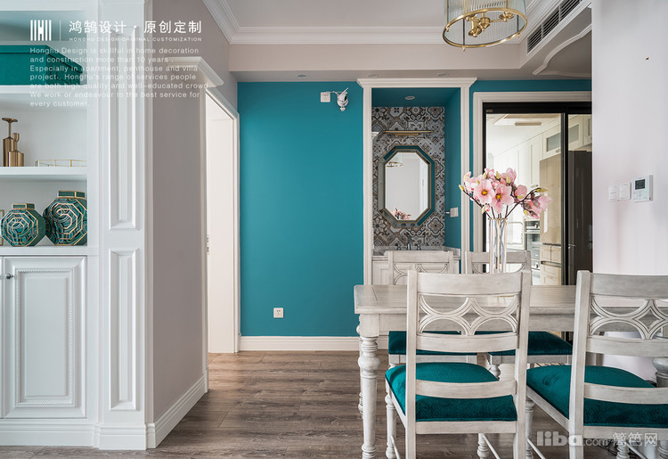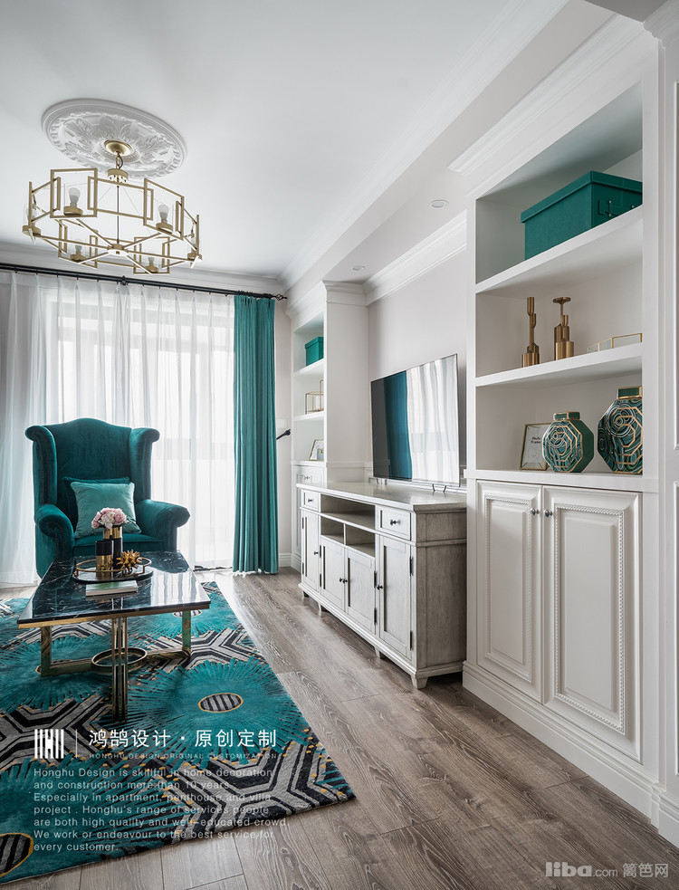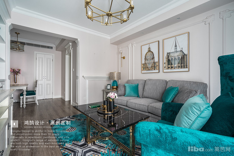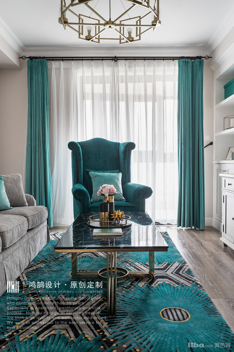 希望不拘泥于传统美式,带入一些轻奢的元素,用出跳的色彩点缀空间,满足女业主对孔雀蓝的喜好。