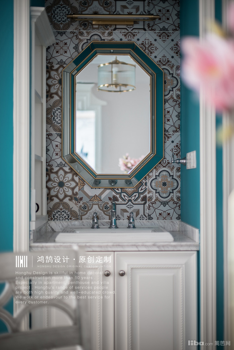 干区左侧做了壁龛,内嵌一组储物柜。墙面用450*450的花砖铺贴,搭配金色边框八角化妆镜,非常优雅,符合女主人的气质。