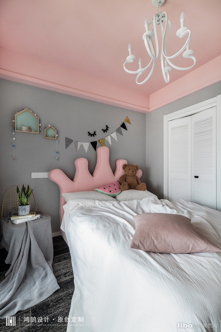 明显和主卧不同风格的儿童卧室,充满公主风格,灰色粉色的搭配更具有高级感,不落俗。