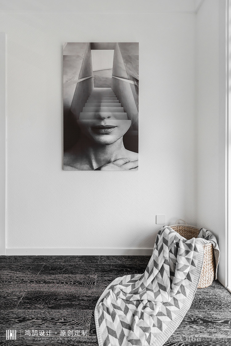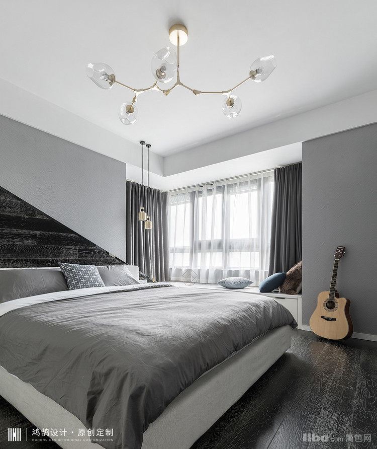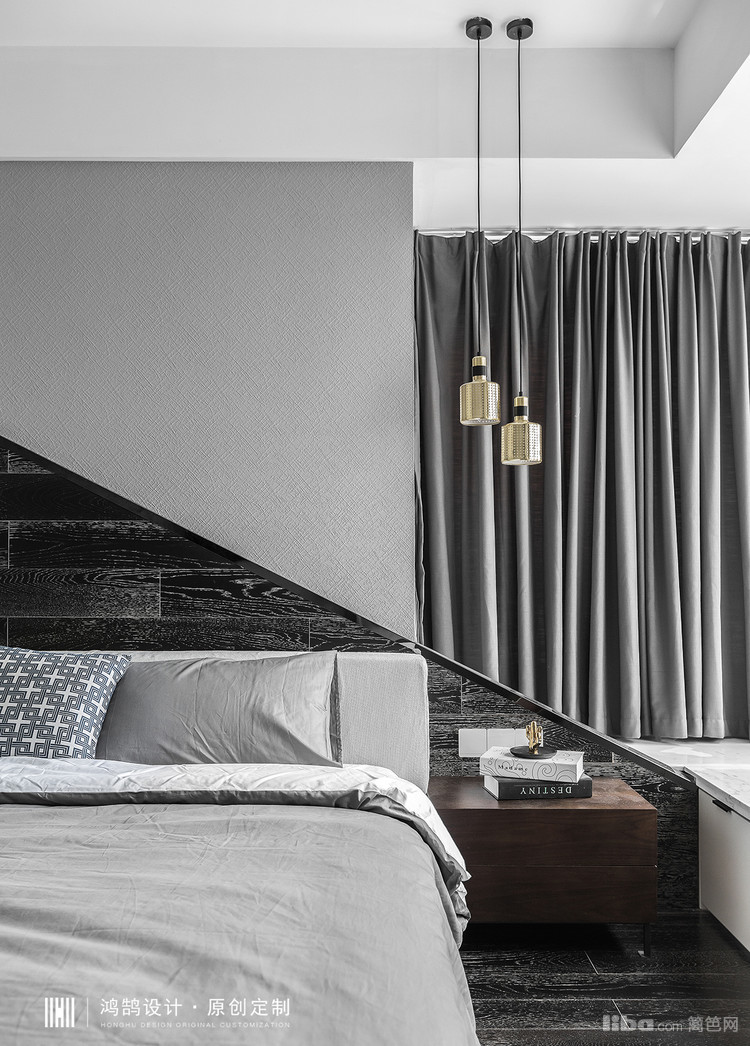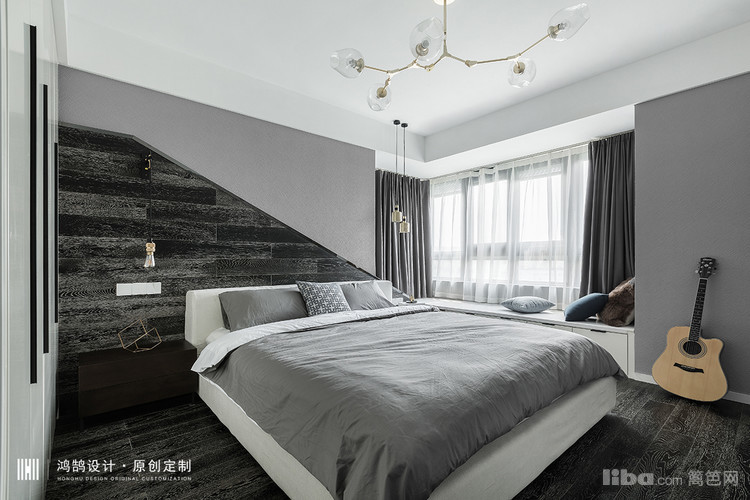主卧室的背景设计上,原始建筑飘窗的位置导致背景并不完整,所以在设计背景的时候保留了它原始的不对称感,做了一个斜面的造型,用地板材质延伸到墙面。