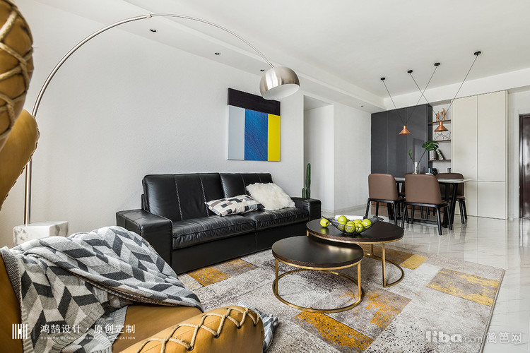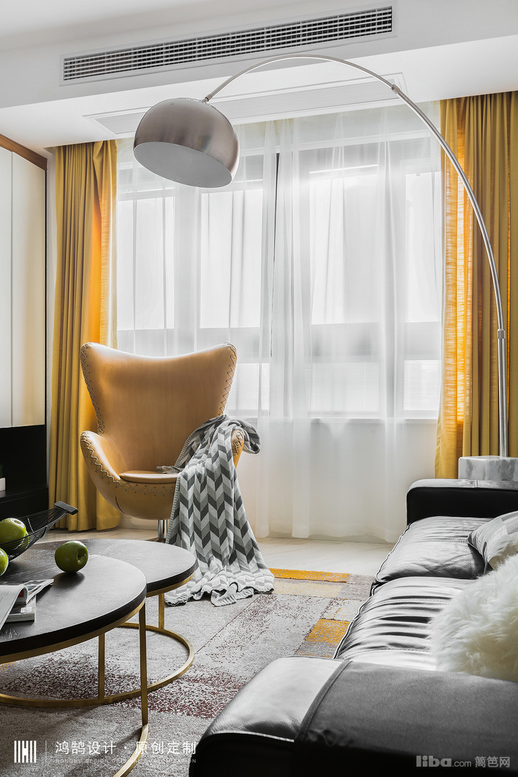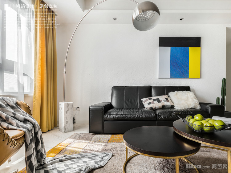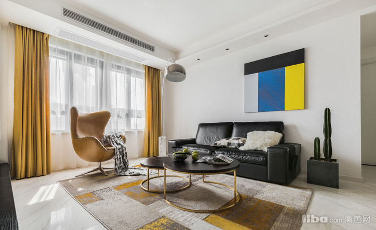 跳跃的黄与主体的黑色相互调和,使得整体空间时尚,颇具品味。设计感十足的落地灯画龙点睛般给客厅增添了质感。