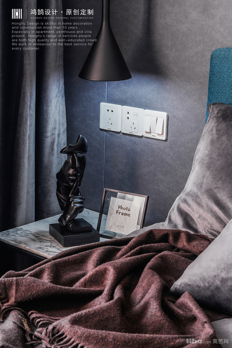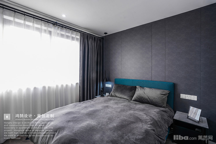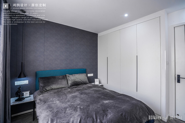 在主卧门的处理上,嵌入了黑色不锈钢线条,增加高级感。主卧的床头背景墙是灰色暗花纹皮革软包,让卧室的睡眠区变得柔软却不失生活感。
