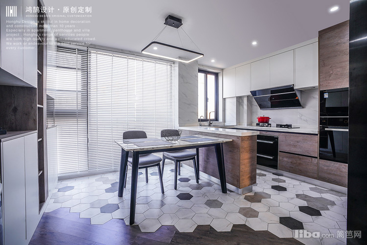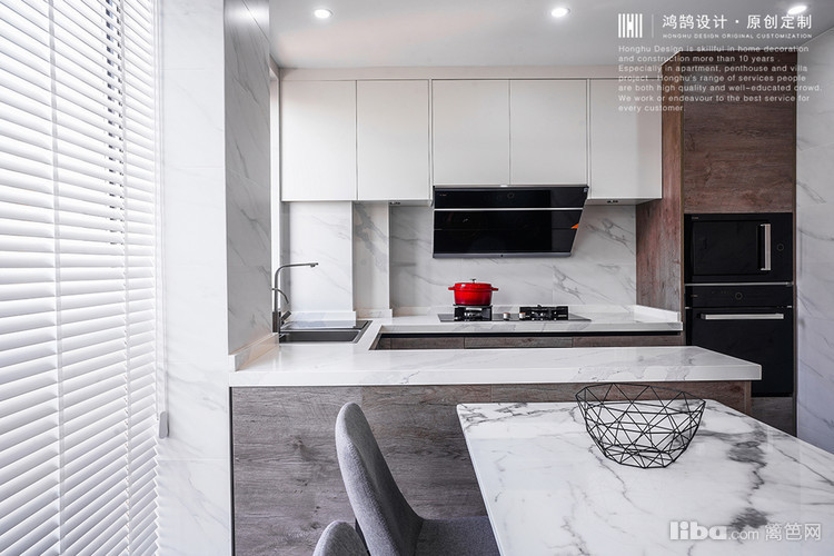 灰色双饰面板,纯白色上吊柜,墙面磁砖和台面以及餐厅桌面颜色选的都是爵士白的,在颜色上相互呼应,完整性更强一些。