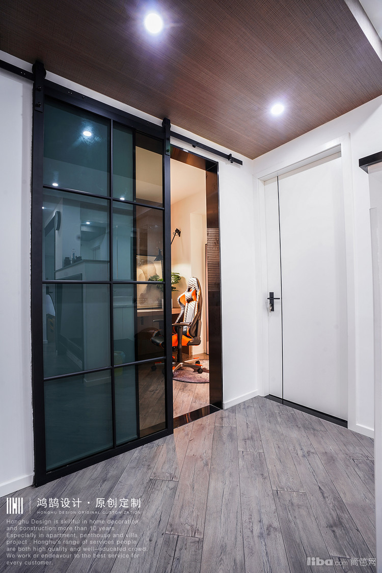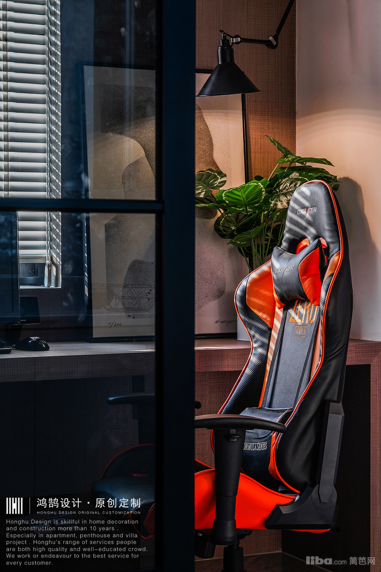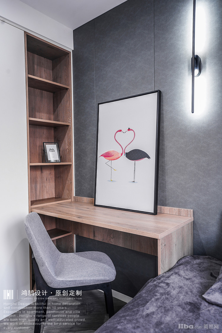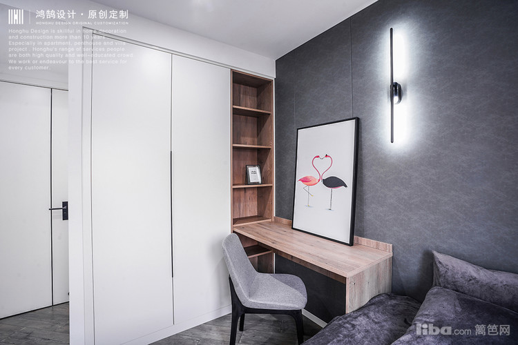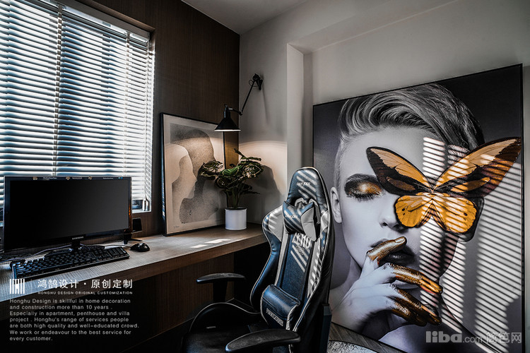 整个书房因为男业主要求设计成为多功能房间,所以设计师设计为L型书桌,灰色木饰面板。一侧平时看书上网用,一侧是专门打游戏用,即使夫妻两个人同时在里面都不会拥挤。
