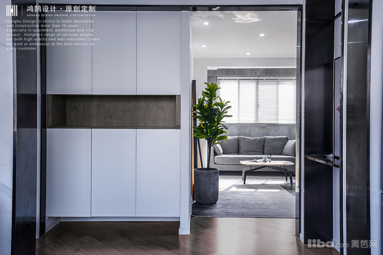 设计师在本案中,在入门左侧做了双排鞋柜和衣柜的设计,并在中间区域设计了置物的凹档空间,方便进门后可以将零碎物品随手放置,下方留有一定空间摆放日常穿的鞋子。