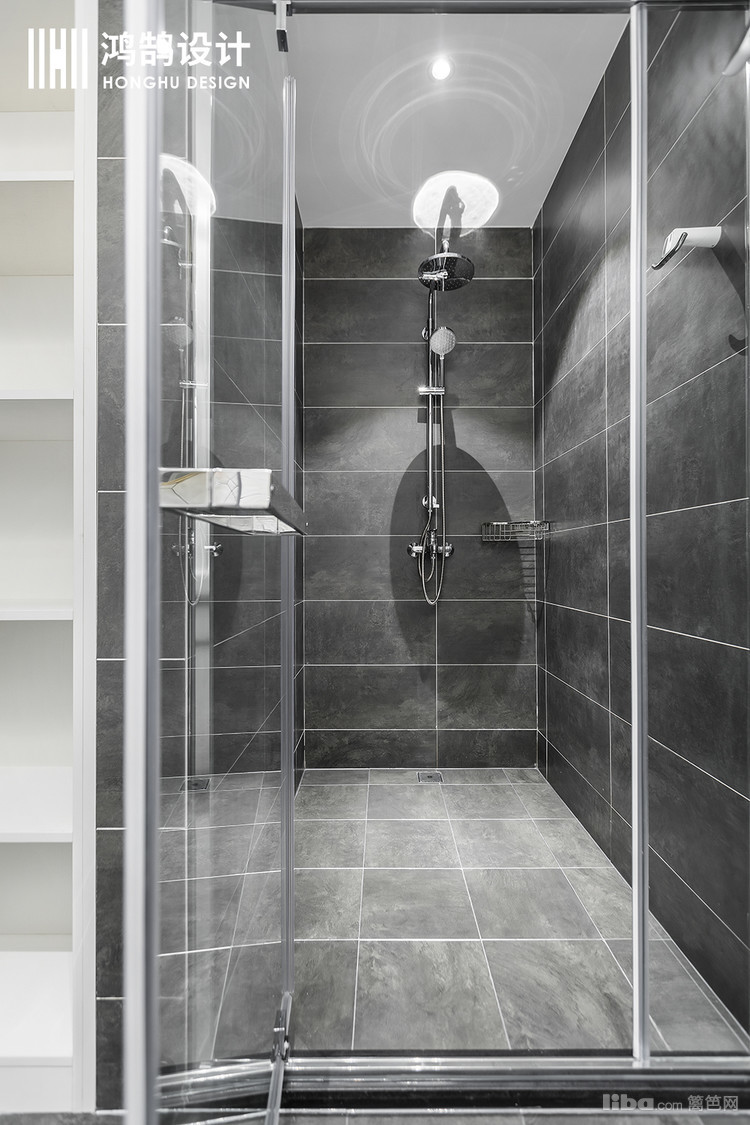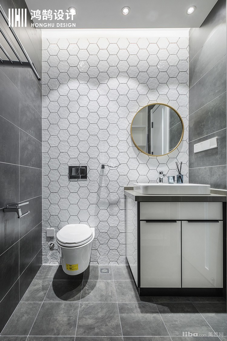 卫生间是整个空间中我个人而言最喜欢的部门,不规则的多边形贴砖很惹人眼,黑白相间之中,用金边的圆形镜子作为点缀,颇具设计感。