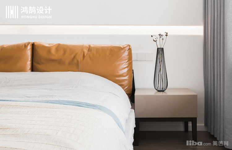 卧室的背景墙上没有选择常规的床头装饰或者落地灯,取而代之的是在原始的墙体上 做了些暗藏灯带的处理 为氛围进行点缀。