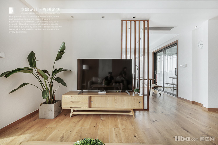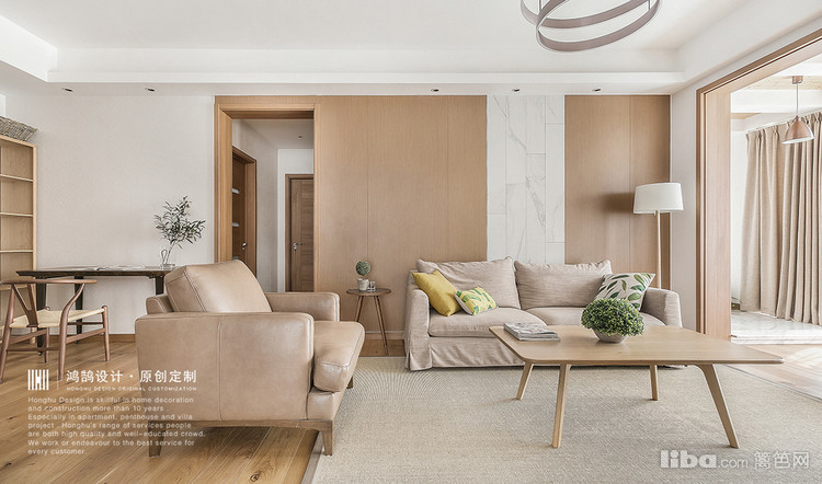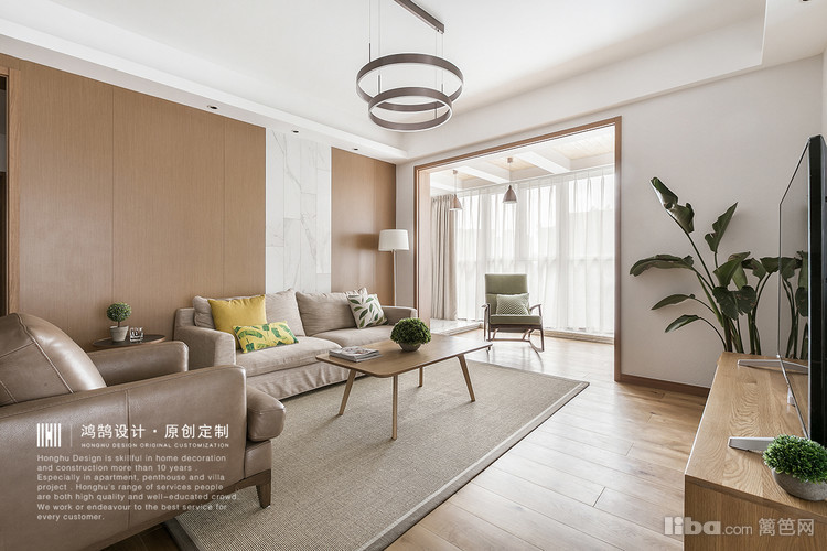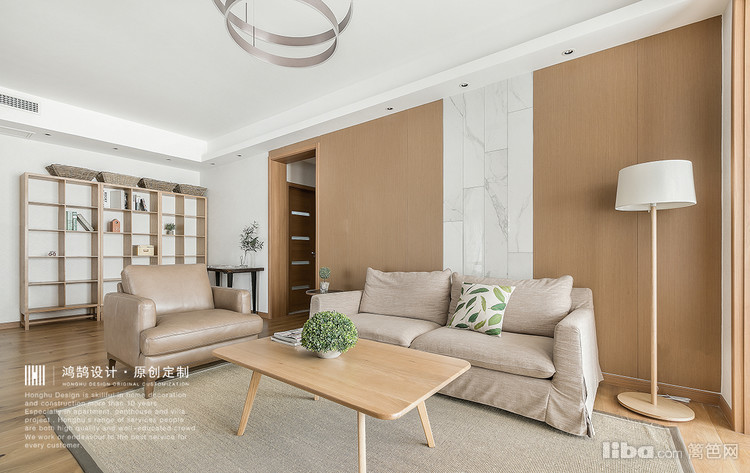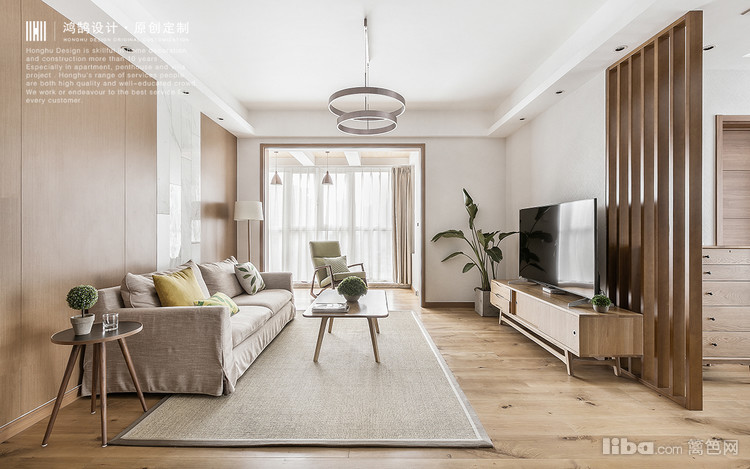 有人会说日系风格有点高冷,其实并不然。日式风格的颜色搭配上往往给人自然纯朴的感觉。客厅实木地板配上浅色的地毯、浅色的沙发、原木的茶几,整体清新淡雅,同时通过绿植的点缀焕发着生机。