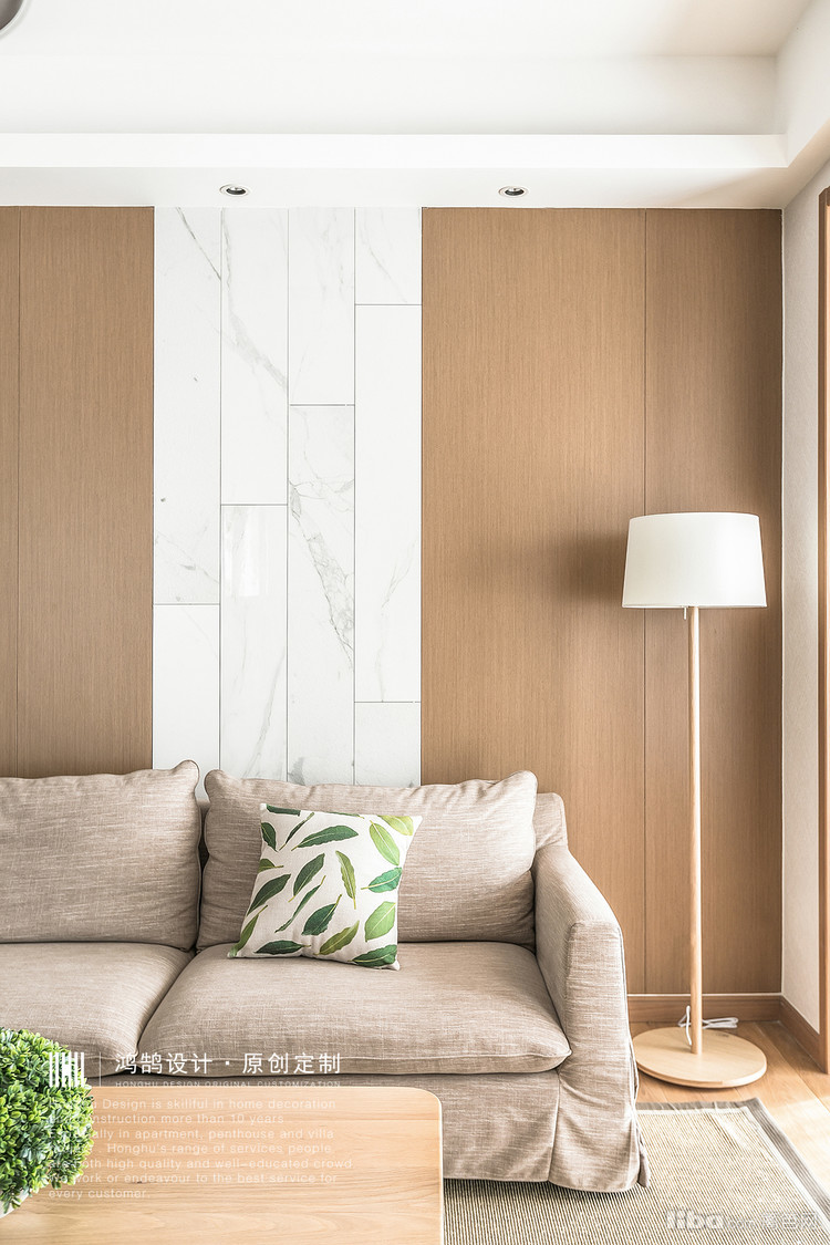 沙发背景采用木饰面,让人回归自然,为生硬的空间增加了温度。