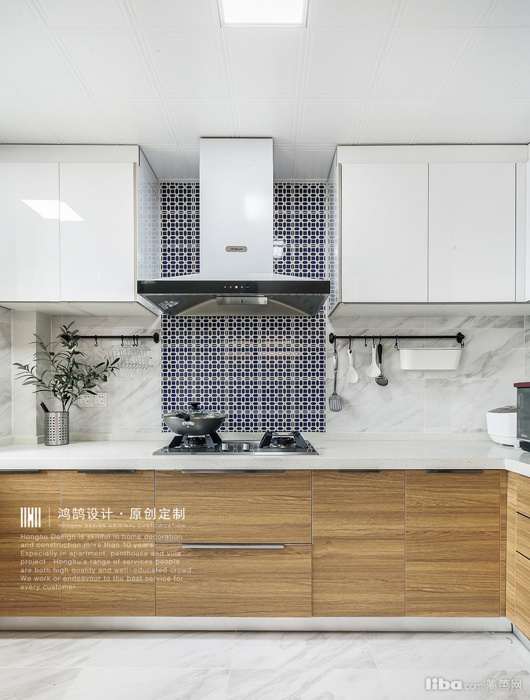 厨房采用白色烤漆面板的吊柜搭配木纹质感的橱柜,满足实用的同时又兼具美观。