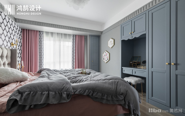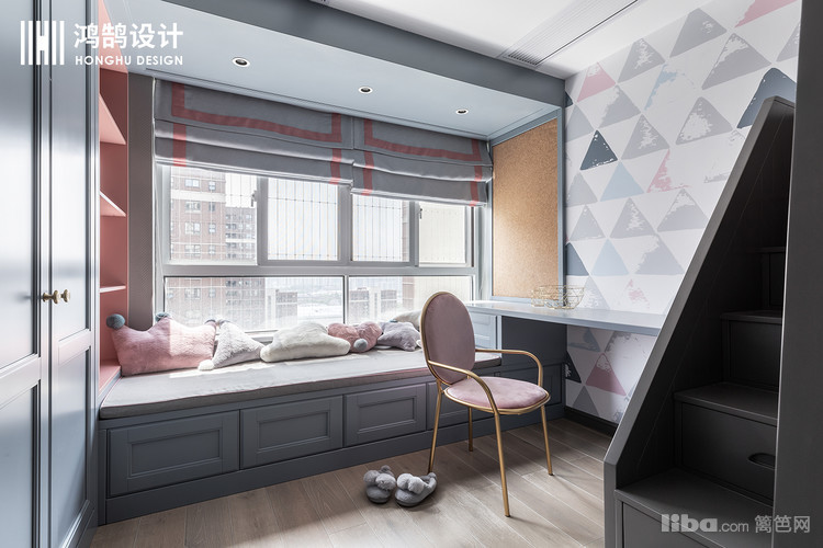 次卧主色调以浅蓝色为主,搭配粉色,营造一股浓浓的公主风。榻榻米床既增加了收纳,也很有层次感。
