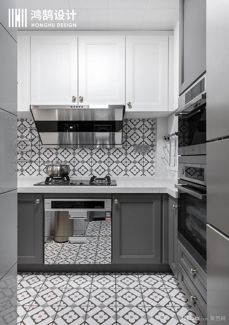 你以为的厨房应该是规规矩矩,横平竖直,但是在整体氛围的衬托下,本案例的厨房延续整体风格,用花砖上墙的形式,让厨房空间显得既不局促又实用性强。