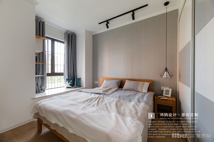 主卧以灰白色调为主,加入温润的原木色系,让卧室的空间变得温和,舒适。
