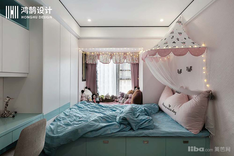 利落的背景墙,搭配灰色布艺床,暖色灯带处理,让整个空间氛围,睡意浓浓,柔软整齐,马卡龙色系的搭配,让整个儿童房变得清爽,且充满童真。