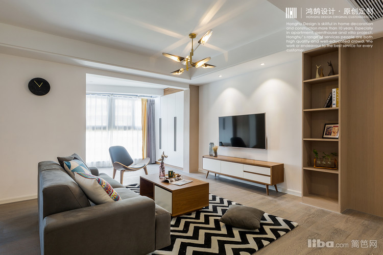 回字形造型吊顶使客厅更加开阔、立体,浅木色的饰面板作为电视背景墙与灰色的沙发形成了很好的色彩融合,把客厅的整体氛围营造的温馨舒适。