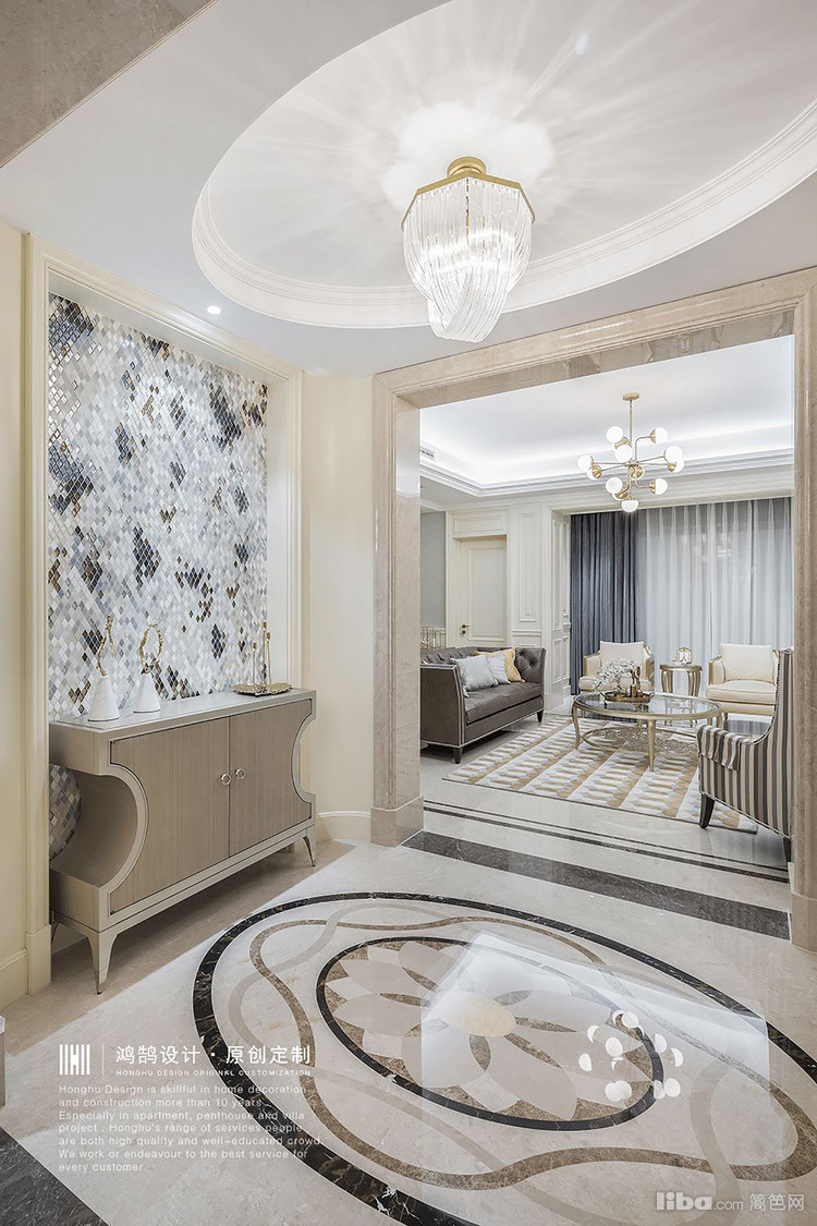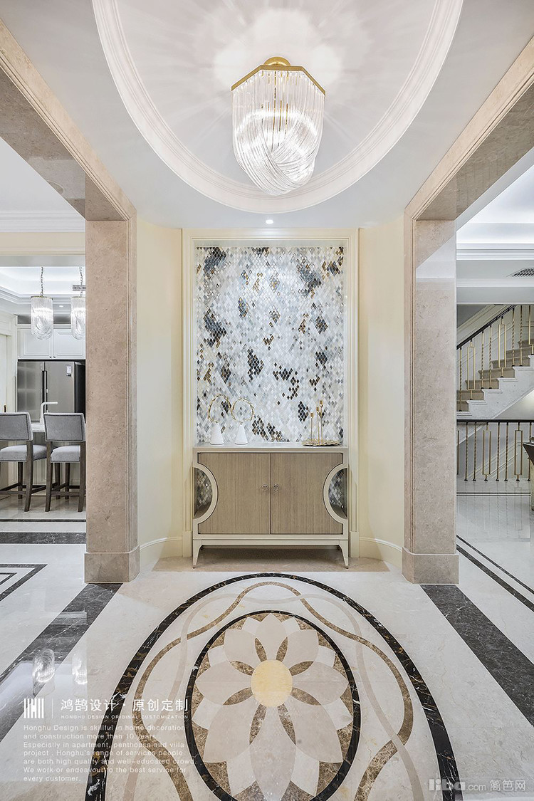映入眼帘的是一幅抽象的马赛克拼贴,地面为白色大理石拼花和墙面及天花造型相呼应,整体色调既舒适又温暖