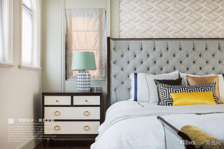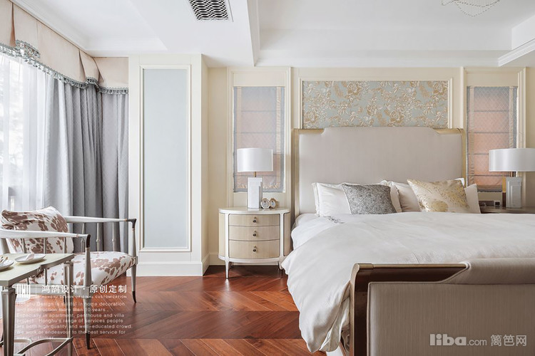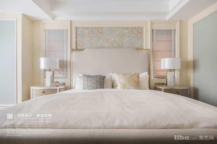 设计师根据身份不同,风格也有很大的区分;主卧是夫妻睡眠休息的区域,在风格上以轻柔为主,米色调与鸭青色相融合,又点缀了豹纹金属元素,增加时尚感和视觉上的舒适度。