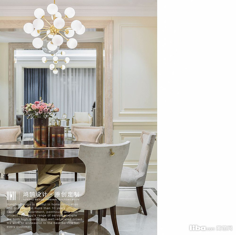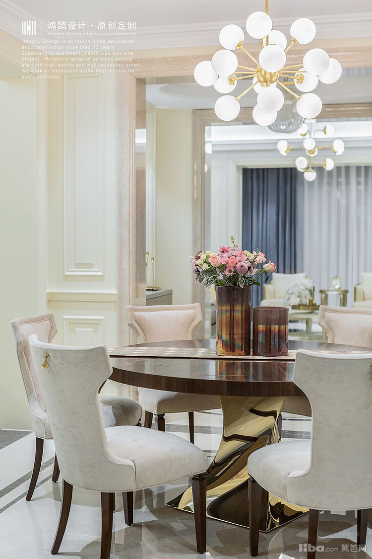 餐厅整体上与客厅呼应,选择了仪式感较重的餐桌,餐椅,在灯光的氛围下降就餐氛围勾勒的浪漫,唯美,且颇具生活氛围。