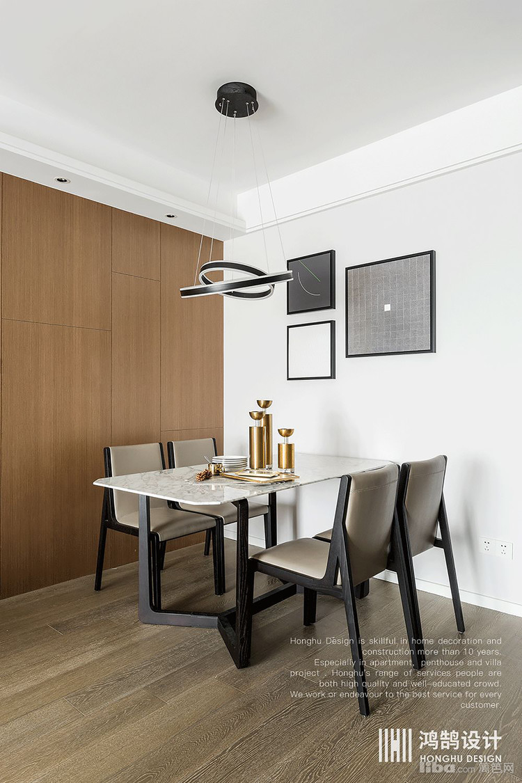 木色的空间里加上大理石餐桌,皮质的餐椅,加上规则的壁画,在理性的空间里加上灯光的氛围,浪漫却如此精致。
