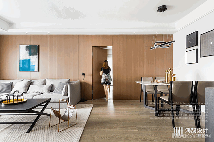 大面积的深色木饰面去装饰墙面,既能够装饰整个墙面,也让整个空间显得精致有格调。隐形门的设计让整个墙面变得整体,而且使得客厅空间有了延伸,使得视觉效果上扩大了客厅的面积