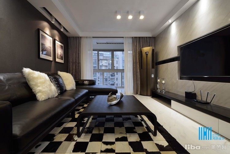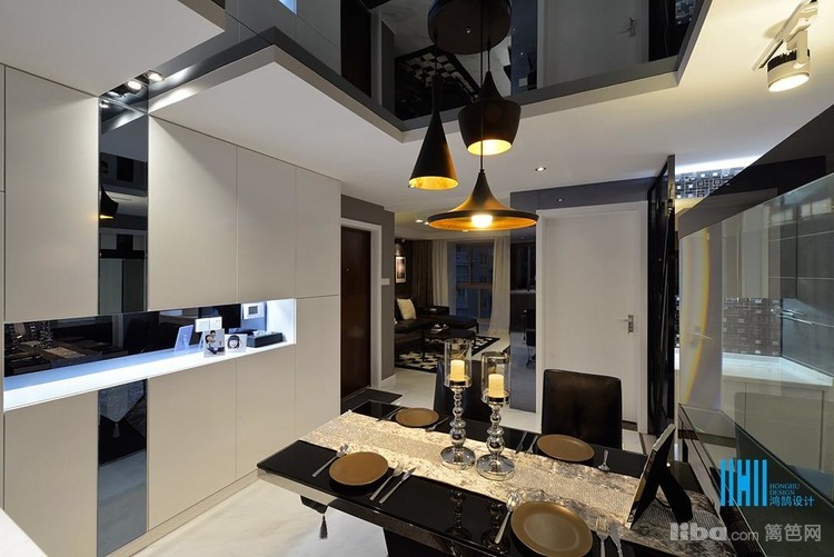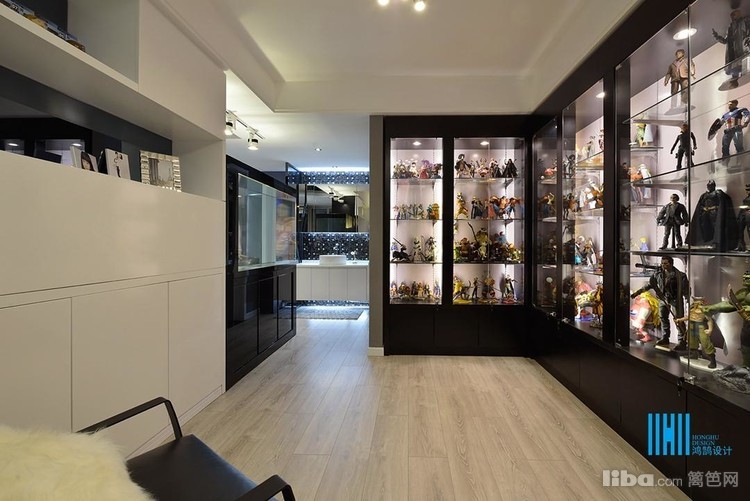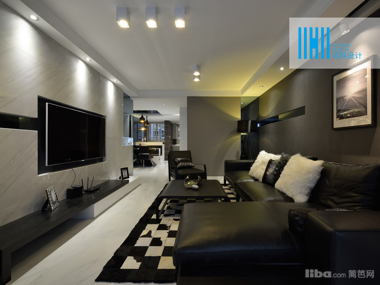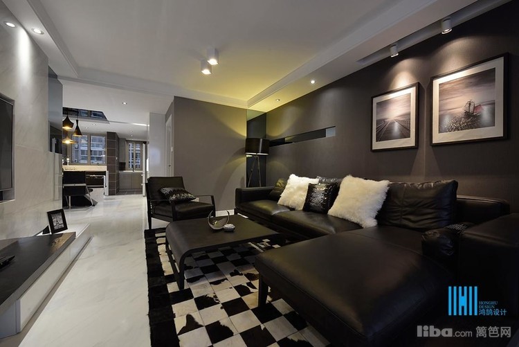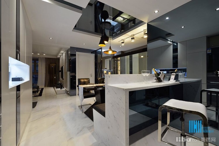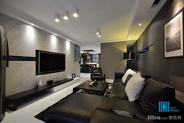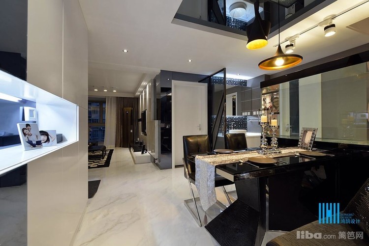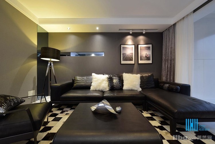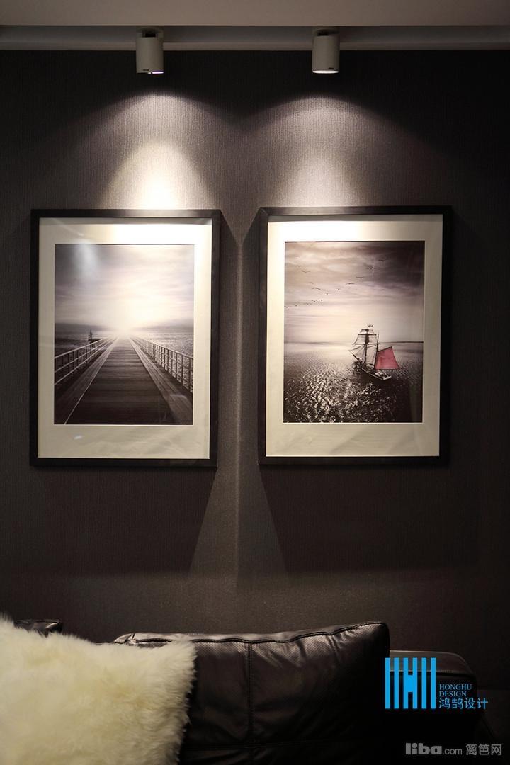 更有趣味的是,黑色后背景墙上,点缀的是白色像框,而白色前背景墙上的装饰是黑色的电视和灰镜玻璃。
