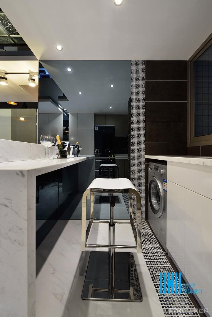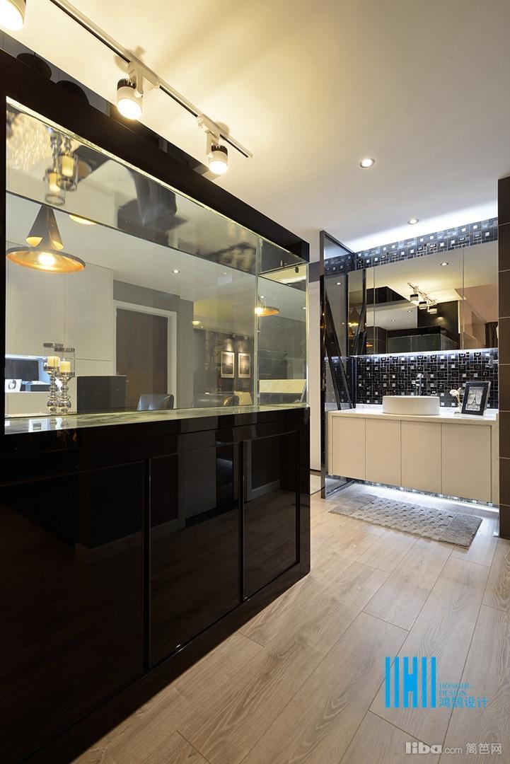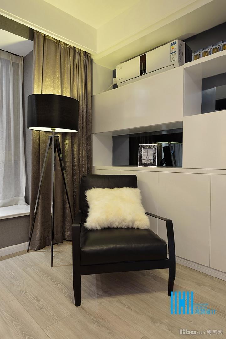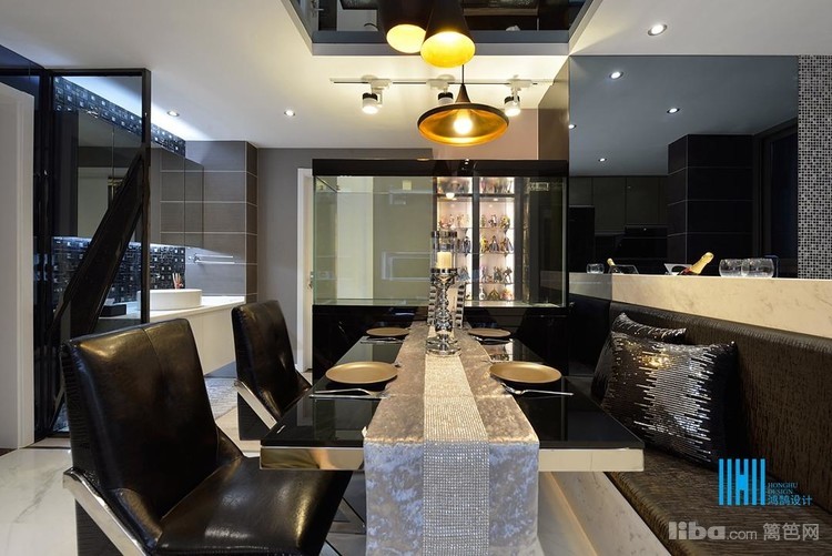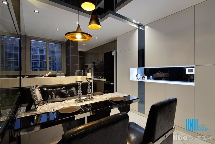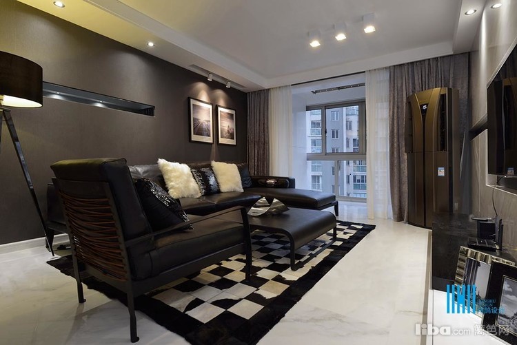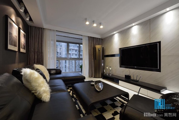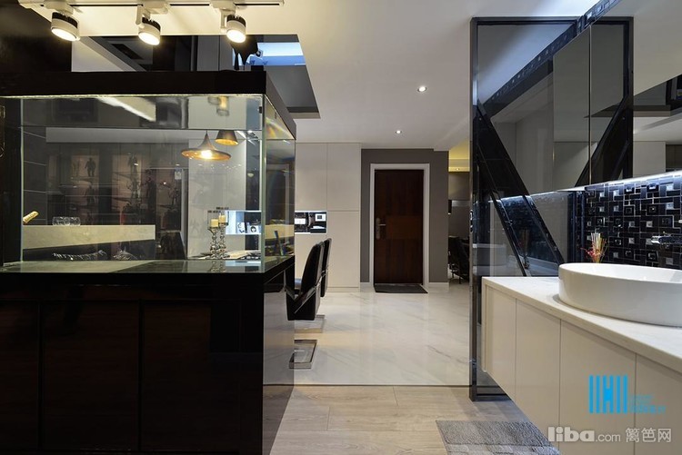 更有趣味的是,黑色后背景墙上,点缀的是白色像框,而白色前背景墙上的装饰是黑色的电视和灰镜玻璃。