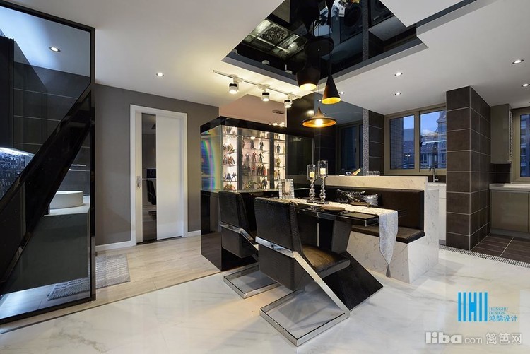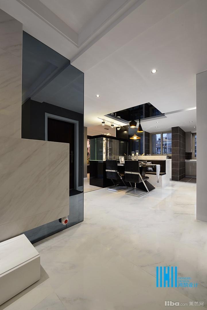 大厅的面貌总是我们的第一视线。深色的背景下,是黑色如油墨的皮沙发;另一面爵士白大理石下,是同样淡色的光洁地面。