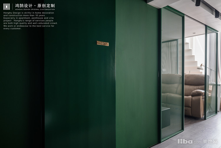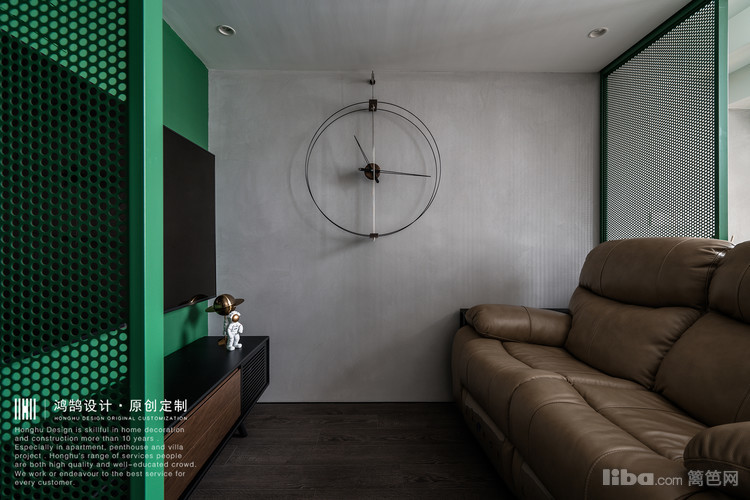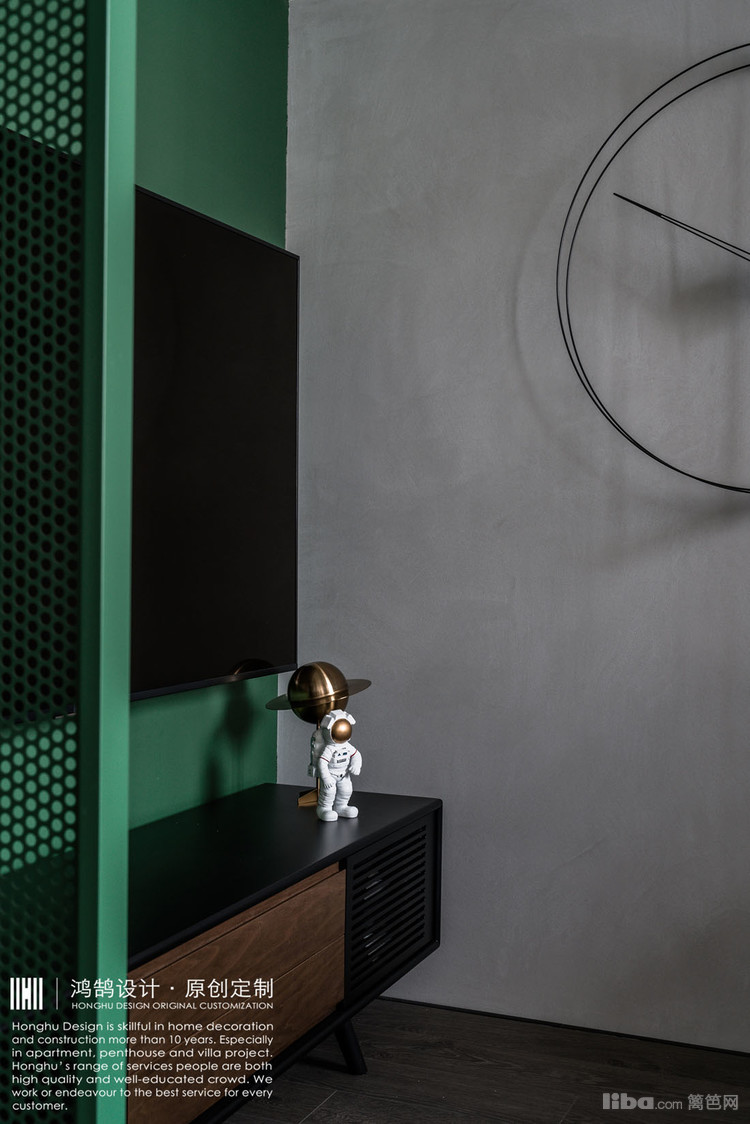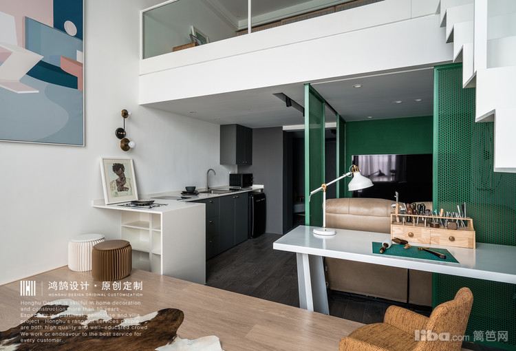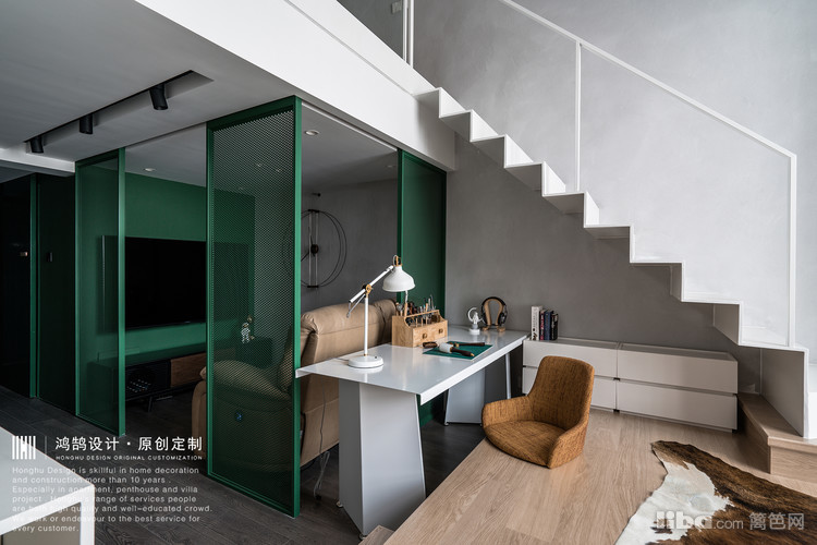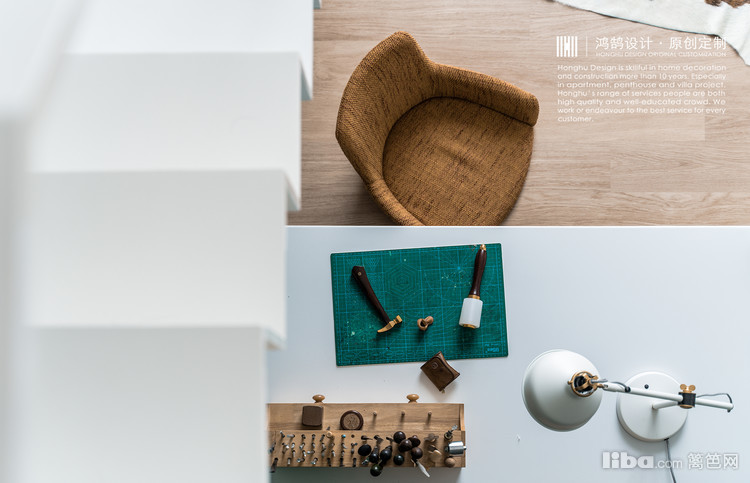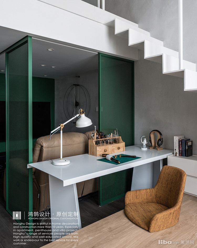 利用楼梯下方的空间,加上地台形成的高度差,我们辟出了一块空间用作手工皮具制作台。半开放式影音区与工作台存在一定空间联系,可以让业主在制作皮具的同时得到观影体验。
