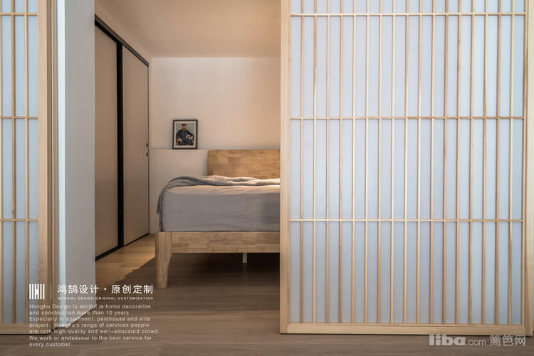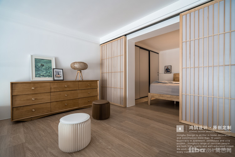 二楼空间层高只有1.9米,我们决定采用明亮的暖色系配色来减少层高过低带来的压抑感,日式的木质隔断双轨移门能够给到卧室里更好的透光性。