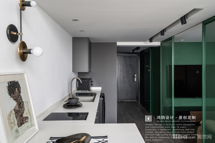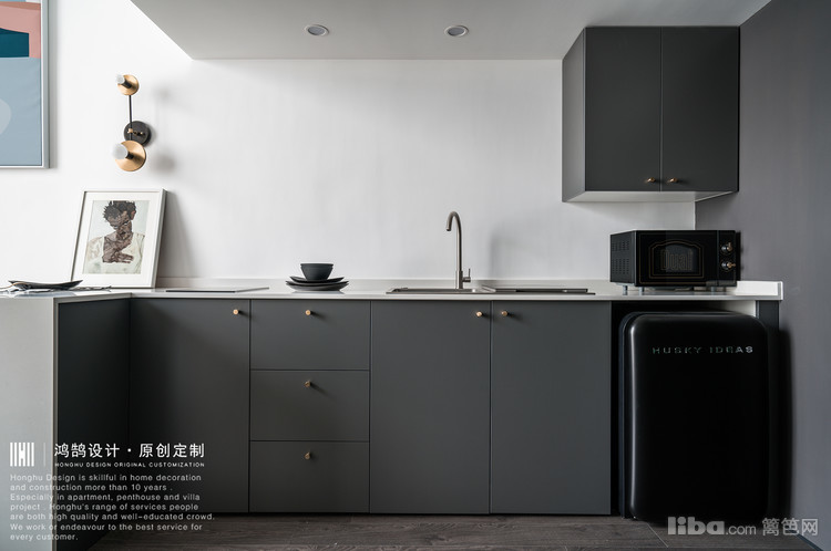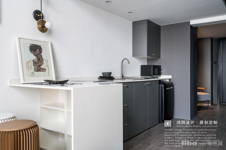 厨房橱柜是在小季定制的,我们选用深灰色面板来起到空间色彩过渡的作用。因为业主极少做饭,只是偶尔制作西餐料理,因此拿掉了油烟机部分,让厨房看起来也更加简洁。