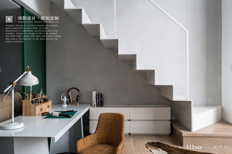 轻盈的白色钢结构楼梯,主要是考虑到功能的同, 弱化楼梯的存在感。
