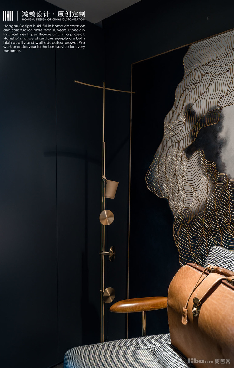 我们在进户门处辟出一块空间留做皮具展示及换鞋区。皮箱是业主自己手工制作的,装饰画与衣帽架我们挑选了金属黄铜质感的款式,与手工皮箱相得益彰,也是业主喜欢的元素。