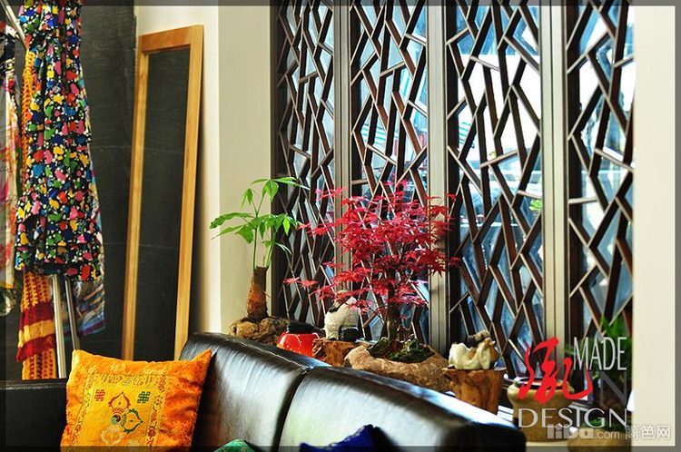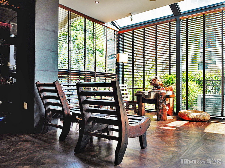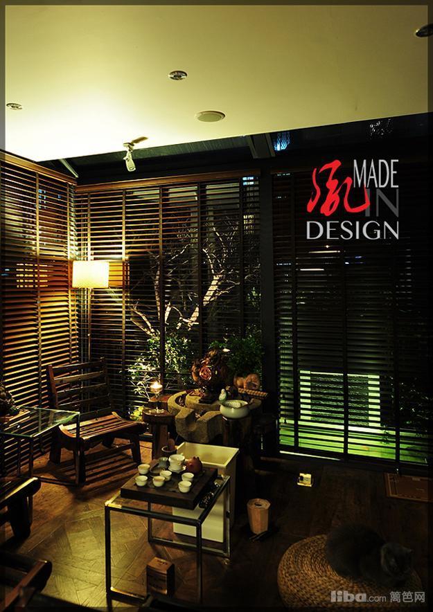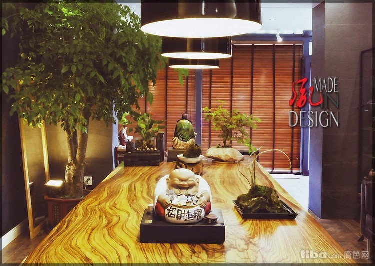 茶道与自然的接轨,无需封闭的空间,半遮半掩的竹帘恰到好处。收起竹帘,挪开玻璃移门后便是一汪绿水,喂喂鱼,养养花,生活情趣相得益彰,怡然自得。