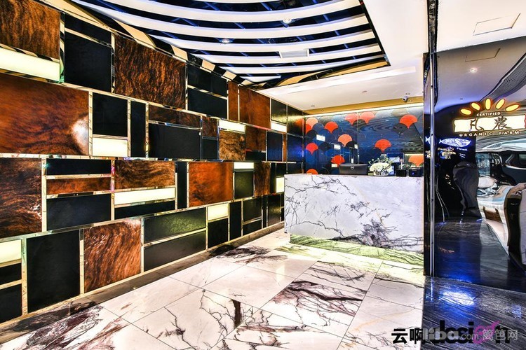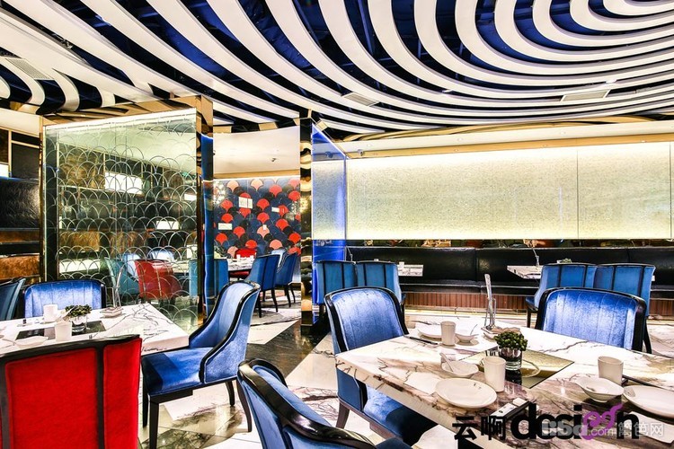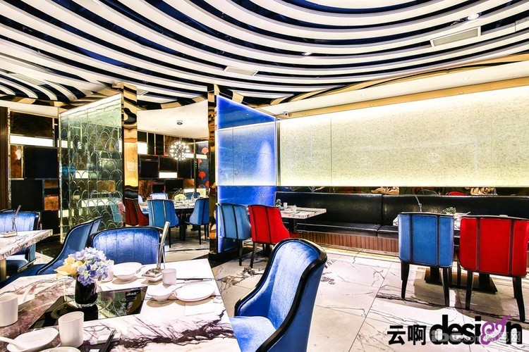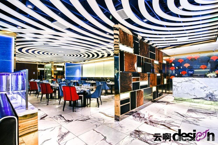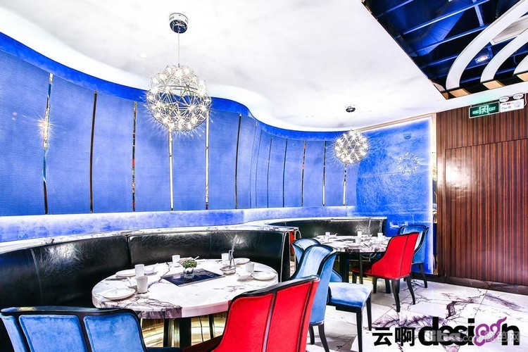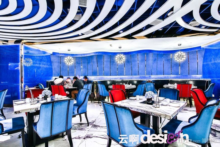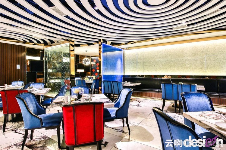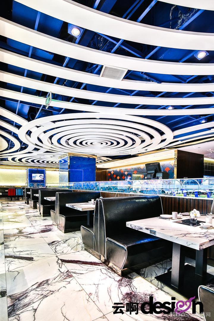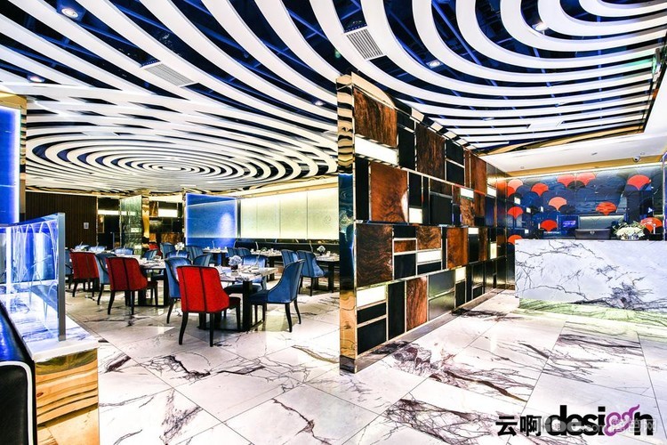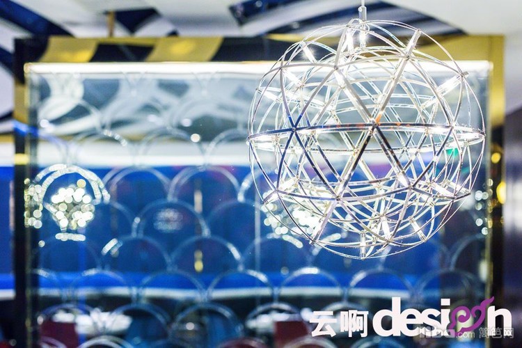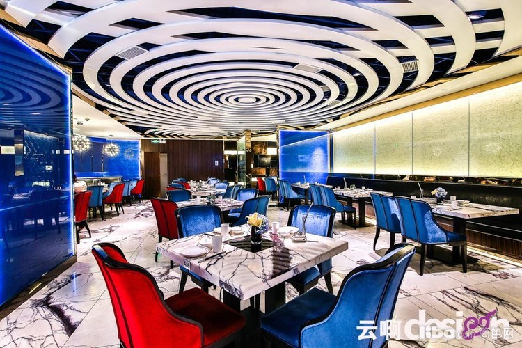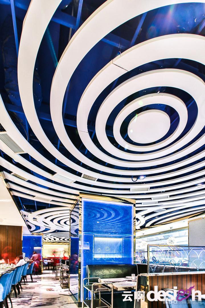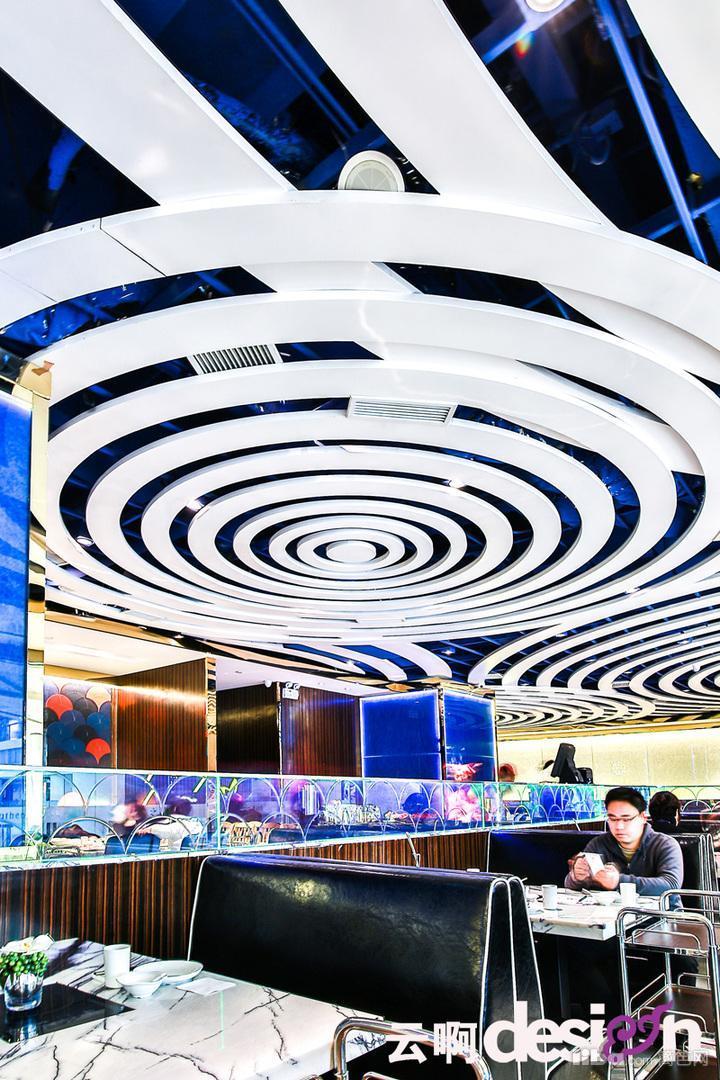进门处的背景墙,选用黑、白、棕三种颜色的马毛与金属拼接,别具一格,更突显了细腻的质感。走进里面,蓝色的光影使得空间里的气息有了一丝流动的意味。一圈圈的白色吊顶,犹如波浪,起起伏伏。