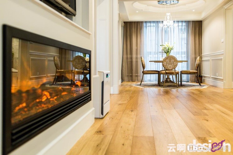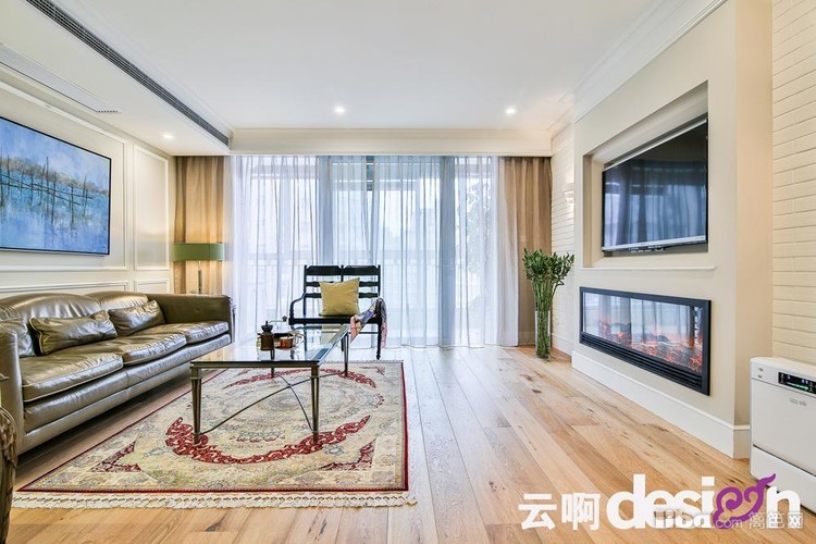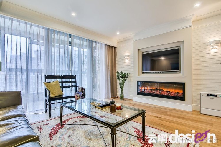 客厅的整个色彩柔和清新,自然橡木色地板天然淳朴,natuzzi沙发却是精致而优雅,深色双人椅、铁艺茶几以及超宽幅嵌入式壁炉让整个客厅精神干练起来。