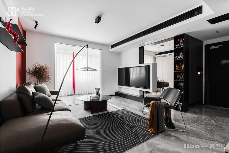 客厅是空间灵魂,那几处点睛的“红”通过材质、形态、观感和触感唤活空间氛围,在黑白极简的对比中,如惊鸿般令人难以忘却。
