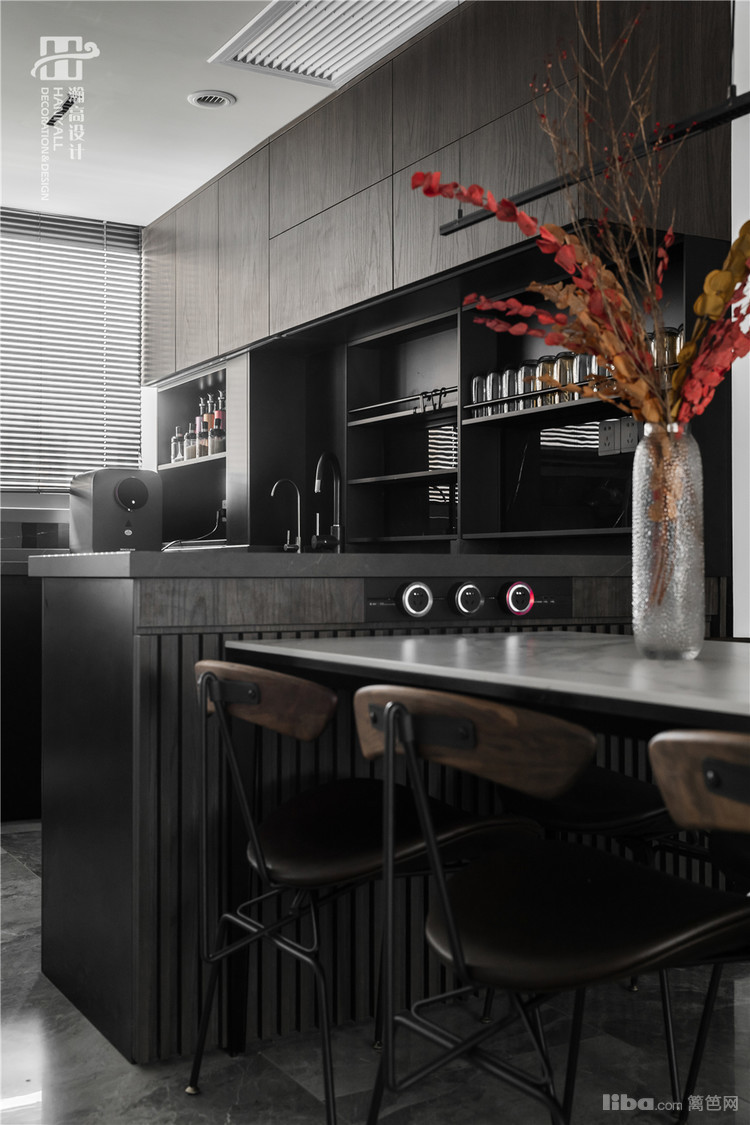 餐厅,完美解锁了鸡肋的过道空间,并利用吧台与厨房衔接,成为了一个开放的深色系餐厨空间。