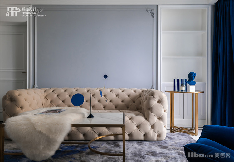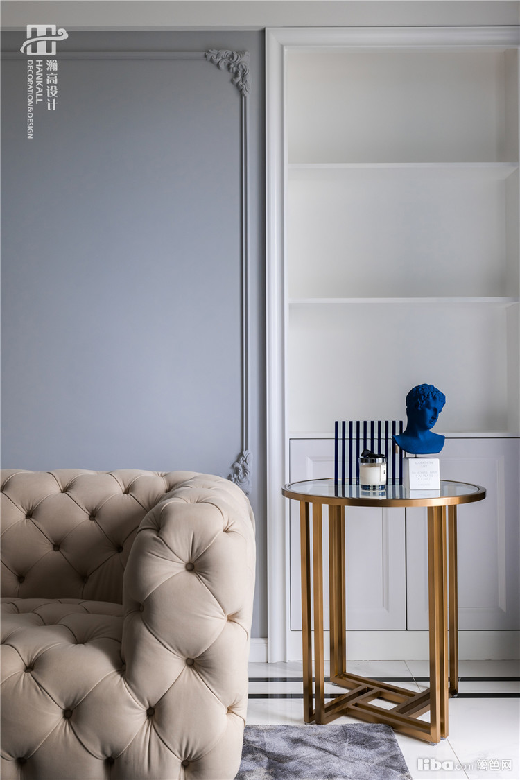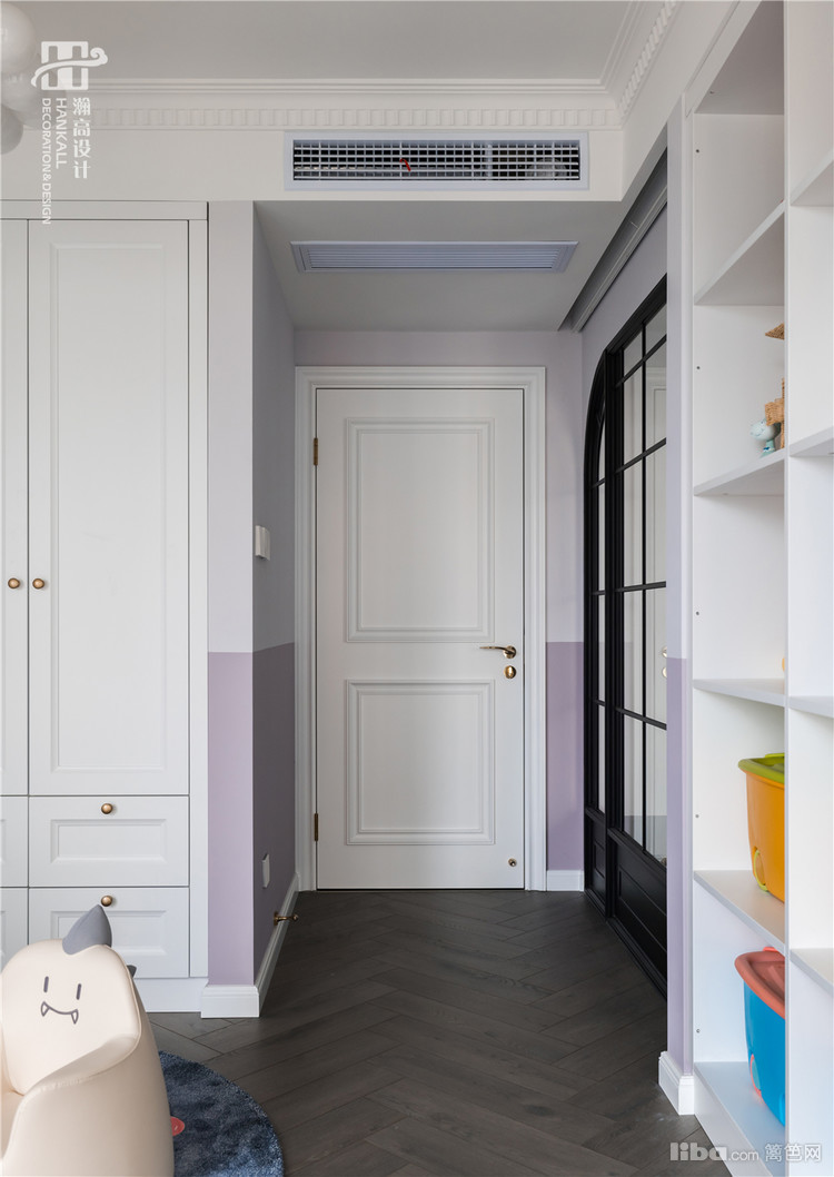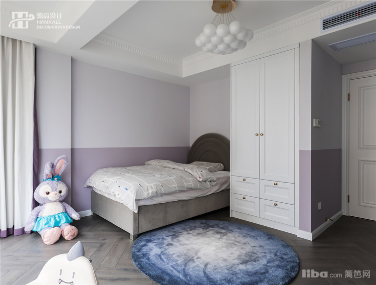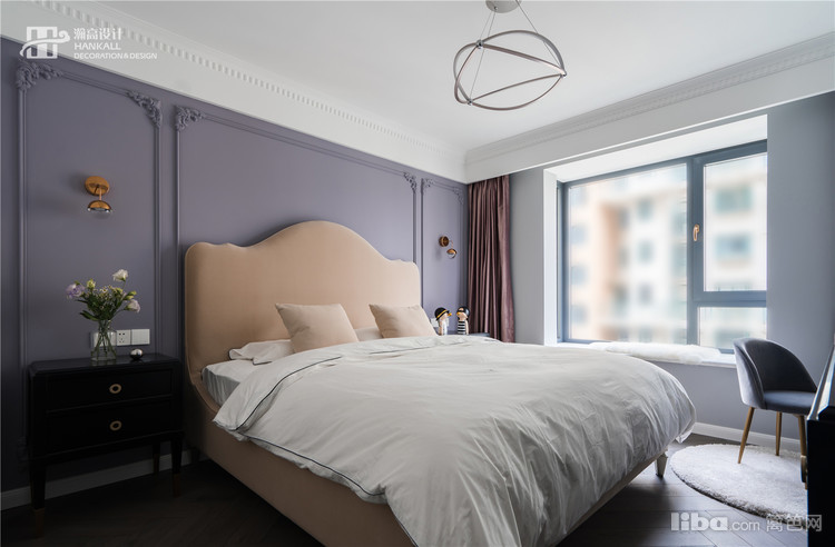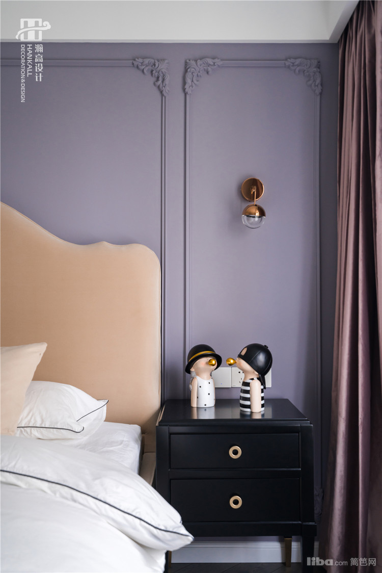 私密性以及舒适度对主卧来说十分重要,选用素雅的紫色作为背景,用法式雕花做搭配,安静内敛。一张弧形的高靠背丝绒床营造出无比舒适的休憩环境。