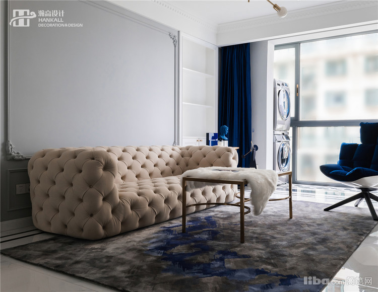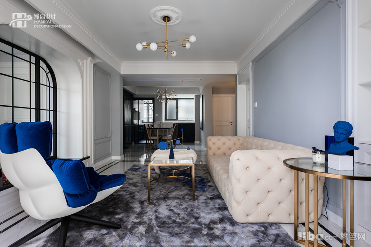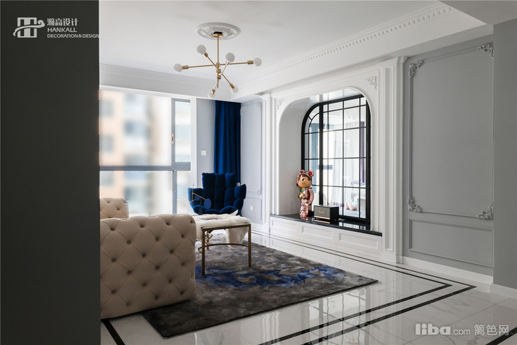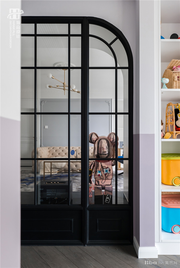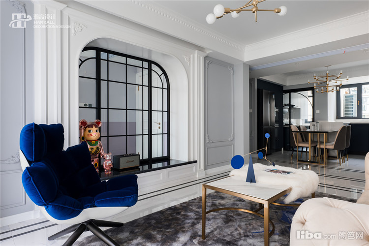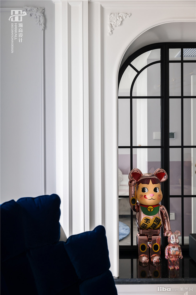 客厅充分利用了自然光,弧形的复古老钢窗隔断更是锦上添花,让空间更为明亮。客厅没有放电视,而是改用投影替代