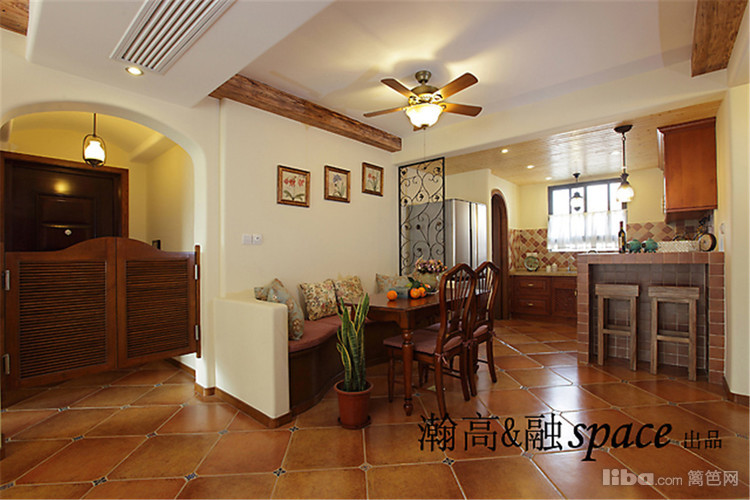 厨房采用了红棕色的橱柜搭配深浅不一的红色小砖,视线进退得宜,层次质感更为丰富。
