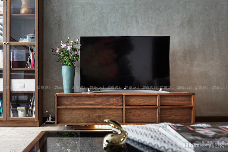 水泥面的电视背景墙与彩色印花的沙发背景墙在,在整个以灰色为主基调的氛围中,形成了强烈的视觉反差,一动一静,相得益彰。