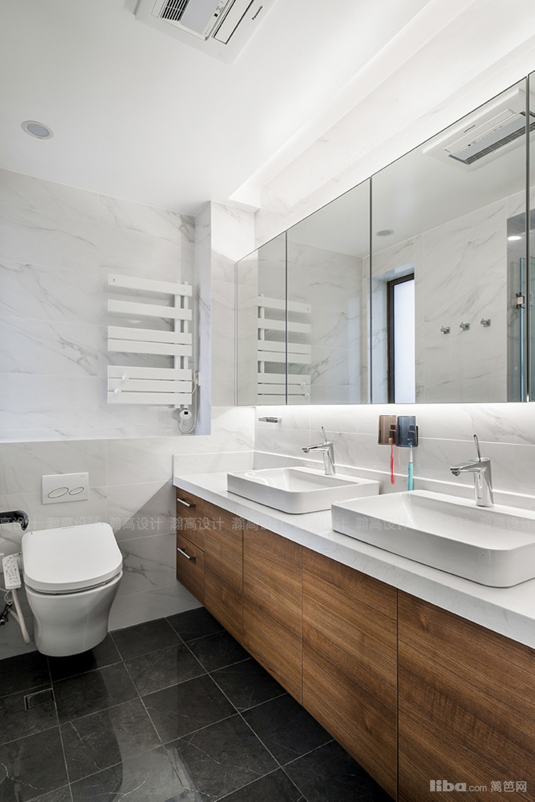 大理石花纹的瓷砖搭配亮白色的卫浴令空间逼格满满,,整墙面的镜柜不仅在视觉上扩大了整体空间,其强大的收纳功能更是让空间保持整洁明了。