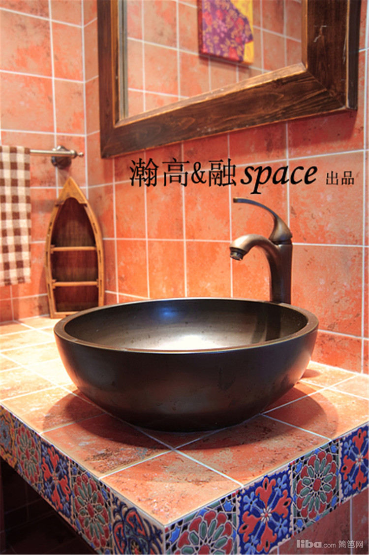 青铜制台盆与红色瓷砖配搭,美轮美奂。