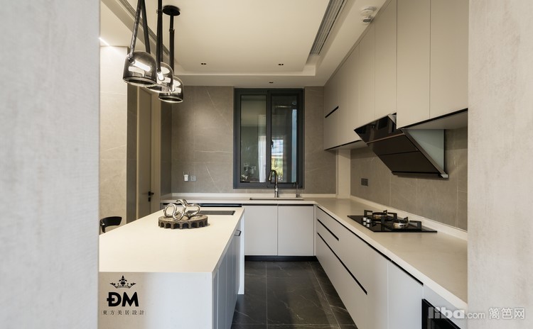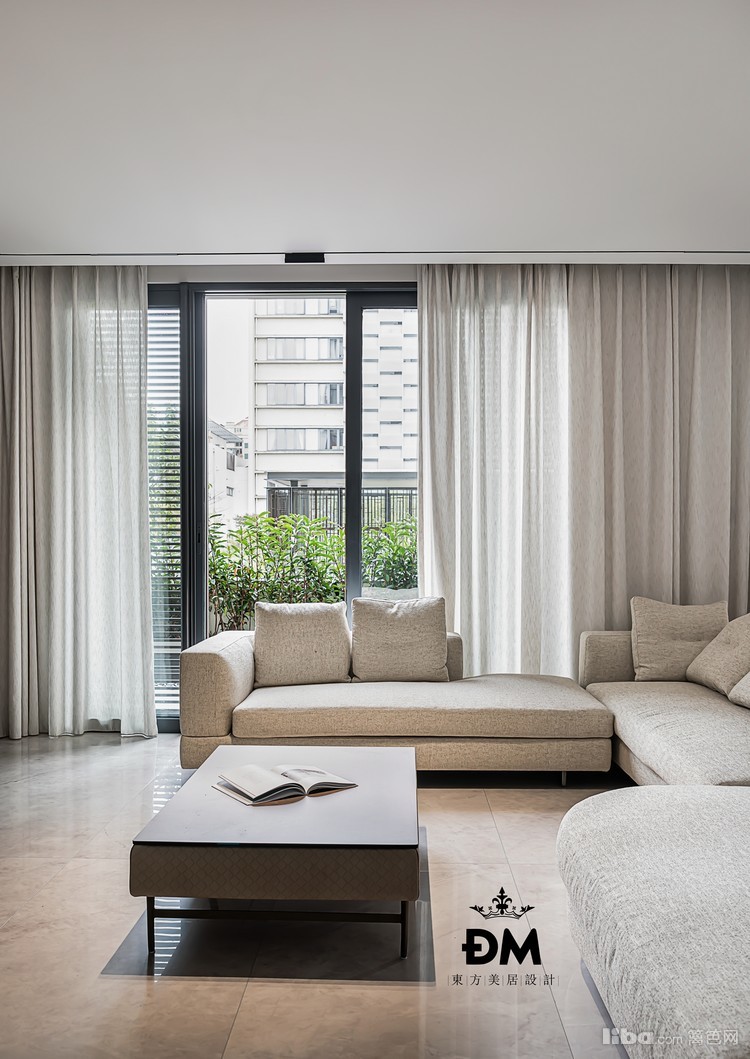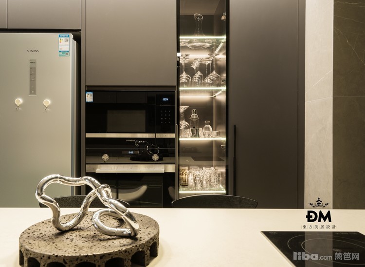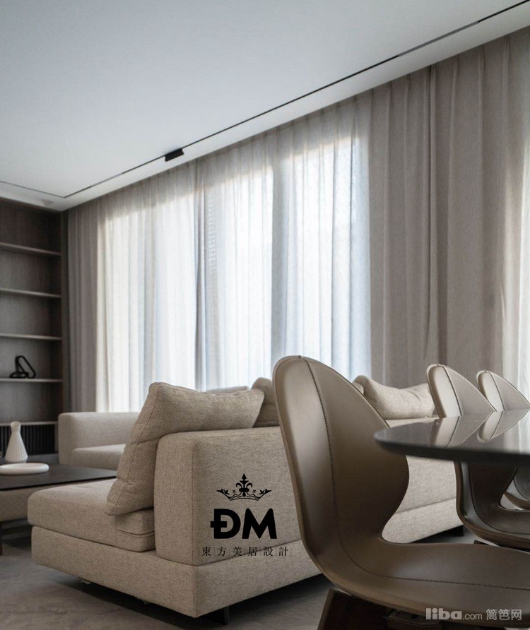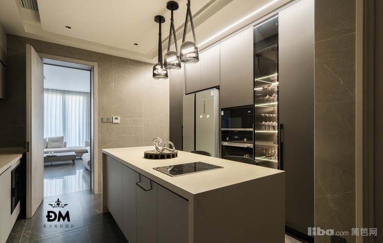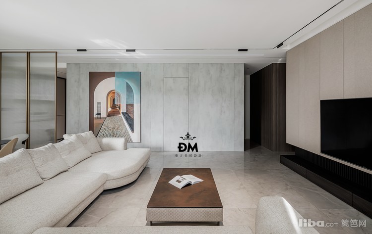 客厅的沙发颜色是呼应电视背景墙和西厨区域,这样整个客厅就有了一个基础主色调,通往厨房的门做了隐形门,这样用软性的方式弱化了厨房门对着客厅的异样感。