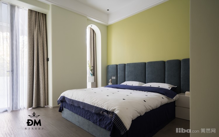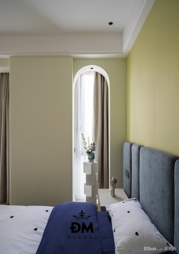 小孩房的窗中间有个承重柱,为了保留采光的同时,弱化被切碎的窗口,两边玻璃的墙面包括顶面都做了圆弧的处理。